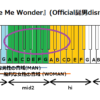 歌メロディーについては冒頭にサビが来て、AメロBメロサビという構成です。キー自体は高いですが、メロディーの音域は少し狭めであります。しかし、同じフレーズでも微妙に音程を変えるなどして、彩りを与える工夫がしてあります。私自身の知識が拙く上手く言語化できないのですが、mid2C~hiDという音域(15個の音)の中で、使える音を上手く使いこなしている印象です。例えば、転調などは行ってないにもかかわらず、サビではmid2G以上の音階ではhiBとhiC#以外の音は全て登場します。音域を調べる中で、ヒゲダンの歌メロディーは高音部を中心に、音を余すことなく使うメロディーの作り方をしているような特徴があるのではないかと私は解釈しています(細かく検証してみても面白いかもしれません)。