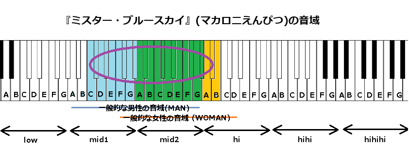 最後に『ミスター・ブルースカイ』の音域についてですが、【地声最低音】mid1C(C3)~【地声最高音】hiA#(A#4)、【裏声最高音】hiB(B4)で歌メロディーが構成されております。一般的な男性の音域と比べ、高いです。以下、見ていきます。