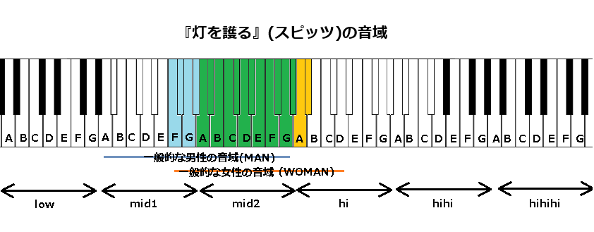 最後に『灯を護る』の音域についてですが、【地声最低音】mid1F(F3)~【地声最高音】hiA#(A#4)で歌メロディーが構成されております。一般的な男性の音域と比べ、高いです。以下、見ていきます。