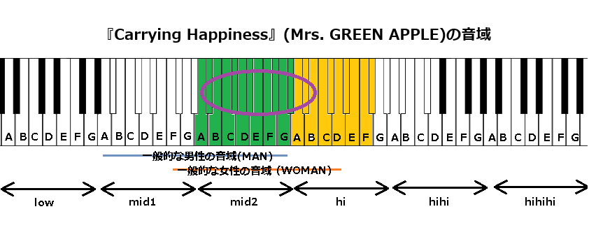 最後に『Carrying Happiness』の音域についてですが、【地声最低音】mid2A(A3)~【地声最高音】hiB(B4)、【裏声最高音】hiF#(F#5)で歌メロディーが構成されております。一般的な男性の音域と比べ、高い(or「かなり高い」)です。以下、見ていきます。