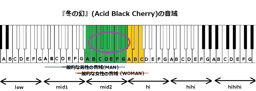 最後に『冬の幻』の音域についてですが、【地声最低音】mid2A(A3)~【地声最高音】hiA(A4)、【裏声最高音】hiC(C5)で歌メロディーが構成されております。一般的な男性の音域と比べ、高い(体感的には「かなり高い」でもよい)です。以下、見ていきます。