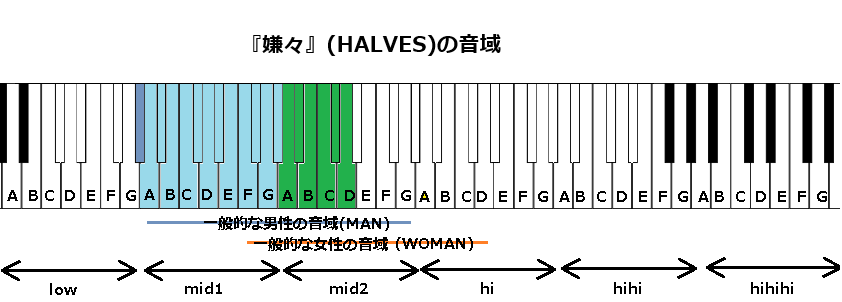 最後に『嫌々』の音域についてですが、【地声最低音】lowG#(G#2)~【地声最高音】mdi2D(D4)で歌メロディーが構成されております。一般的な男性の音域の範囲内(J-POPの男性曲としては(やや)低め)です。以下、見ていきます。