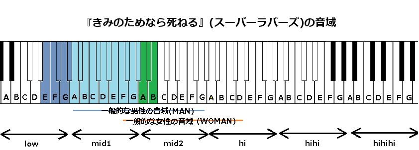 最後に『きみのためなら死ねる』の音域についてですが、【地声最低音】lowE(E2)~【地声最高音】mid2B(B4)で歌メロディーが構成されております。一般的な男性の音域と比べ、低いです。以下、見ていきます。