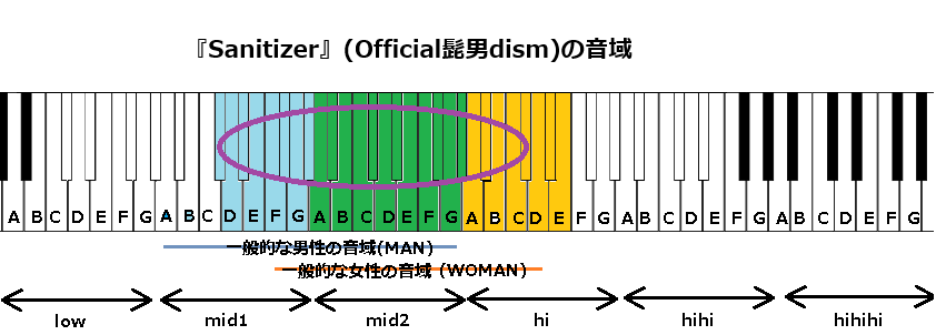 最後に『Sanitizer』の音域についてですが、【地声最低音】mid1C#(C#3)~【地声最高音】hiC#(C#5)、【裏声最高音】hiE(E5)で歌メロディーが構成されております。一般的な男性の音域と比べ、かなり高いです。以下、見ていきます。