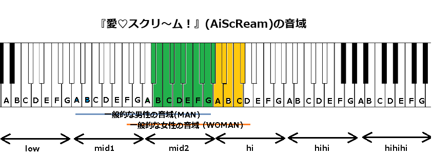 最後に『愛♡スクリ~ム!』の音域についてですが、【地声最低音】mid2A#(A#3)~【地声最高音】hiC#(C#5)で歌メロディーが構成されております。一般的な女性の音域と比べ、高めです。以下、見ていきます。