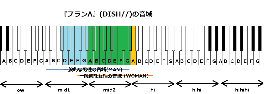 最後に『プランA』の音域についてですが、【地声最低音】mid1C#(G3)~【地声最高音】hiA(A4)で歌メロディーが構成されております。一般的な男性の音域と比べ、高めです。以下、見ていきます。