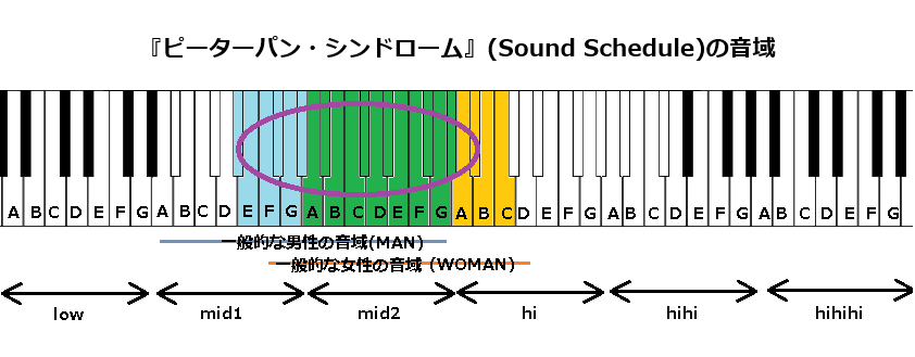 最後に『ピーターパン・シンドローム』の音域についてですが、【地声最低音】mid1D#(D#3)~【地声最高音】hiA#(A#4)、【裏声最高音】hiC(C5)で歌メロディーが構成されております。一般的な男性の音域としては高いです。以下、見ていきます。