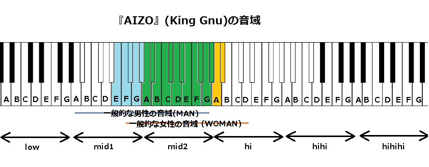 最後に『AIZO』の音域についてですが、【地声最低音】mid1E(E3)~【地声最高音】hiA#(A#4)、【裏声最高音】hiA#(A#4)で歌メロディーが構成されております。一般的な男性の音域と比べ、高め(もしくは明確に高い)です。以下、見ていきます。