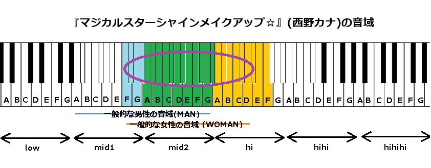 最後に『マジカルスターシャインメイクアップ☆』の音域についてですが、【地声最低音】mid1F(F3)~【地声最高音】hiD#(D#5)、【裏声最高音】hiF(F5)で歌メロディーが構成されております。一般的な女性の音域と比べ、高いです。以下、見ていきます。