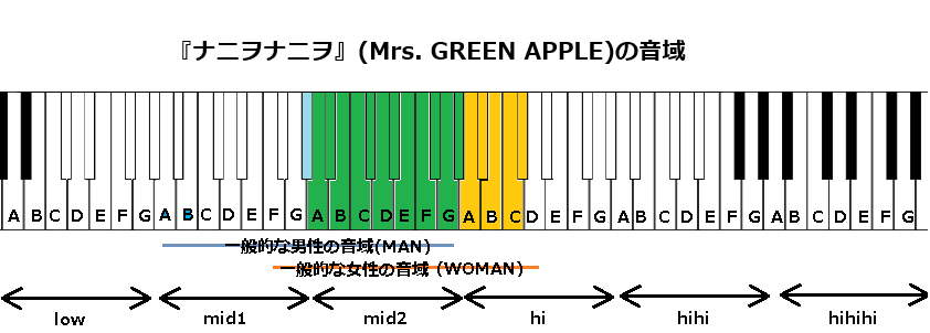 今回の楽曲は全体を通して中高音が多く、サビの見せ場などでhiC#やhiA#等が登場します。低音もmid1G#と高いことなどを踏まえると、中高音域が得意な男性などが原曲キーで歌いやすい曲であると分析しました。ただ、①hiA#が意外と少ない点、②間奏がそれなりにあることなどを考慮すると、地声最高音hiC#の曲としては歌いやすいとも考えています(それでも一般よりずっと高い)。今回は要所で裏声が見られますが、現在のミセスと比べるとロック色が強く、力強いの高音の回数も目立つ印象です。