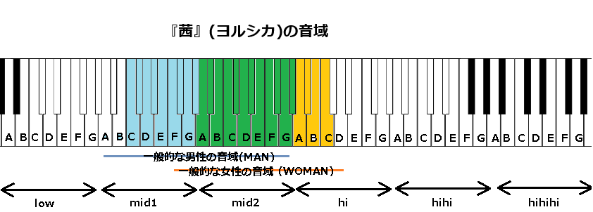 最後に『茜』の音域についてですが、【地声最低音】mid1C(C3)~【地声・裏声最高音】hiC(C5)で歌メロディーが構成されております。一般的な女性の音域と比べ、低音がかなり低いです。以下、見ていきます。
