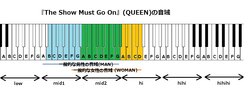 最後に『The Show Must Go On』の音域についてですが、【地声最低音】mid1B(B2)~【地声最高音】hiD(D5)で歌メロディーが構成されております。一般的な男性の音域と比べ、かなり高いです。以下、見ていきます。