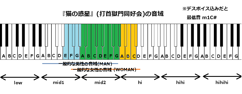 『猫の惑星』の音域的な特徴についてです。同曲はメインボーカルを男性、サブボーカルを女性が担当し歌メロが作られています。男性の音域については、男性の音域としては高いレンジで歌メロが作られています(女性については大よそ標準的)。一般的には少しキーを下げた方が歌いやすいです。