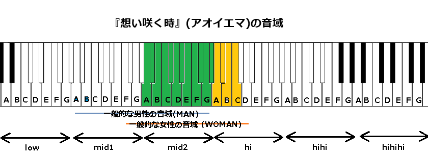 『想い咲く時』を原曲キーで歌唱する場合、hiA~hiCといった中高音域がしっかり歌いこなせることが求められます。今回はサビやBメロでhiCが登場し、全体でみるとhiA辺りが多いです。hiCの回数や発声ニュアンスなどを考えると標準的(orやや高め)位だと思います。低音はおおよそ標準的です。