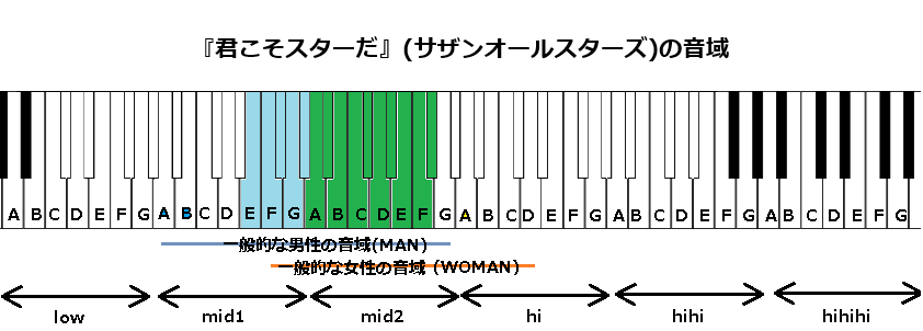 最後に『君こそスターだ』の音域についてですが、【地声最低音】mid1E(E3)~【地声最高音】mid2F#(F#4)で歌メロディーが構成されております。一般的な男性の音域と比べ、やや高め(もしくは「高め」)です。以下、見ていきます。