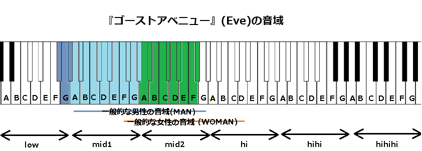 最後に『ゴーストアベニュー』の音域についてですが、【地声最低音】lowF#(F#2)~【地声最高音】mid2F#(F#4)で歌メロディーが構成されております。一般的な男性の音域の範囲内です。以下、見ていきます。