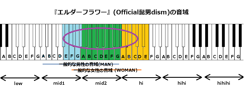 最後に『エルダーフラワー』の音域についてですが、【地声最低音】mid1D#(D#3)~【地声最高音】hiC#(C#5)、【裏声最高音】hiE(E5)で歌メロディーが構成されております。一般的な男性の音域と比べ、かなり高いです。。以下、見ていきます。