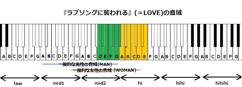最後に『ラブソングに襲われる』の音域についてですが、【地声最低音】mid2D(D4)~【地声最高音】hiE(E5)、【裏声最高音】hiE(E5)で歌メロディーが構成されております。一般的な女性の音域と比べ、高いです。以下、見ていきます。
