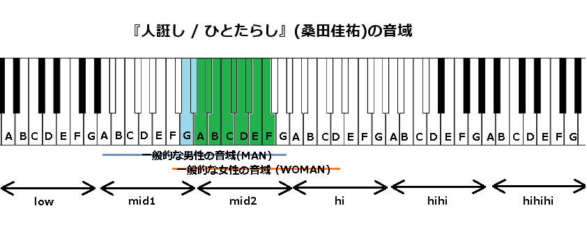 最後に『人誑し / ひとたらし』の音域についてですが、【地声最低音】mid1G(G3)~【地声最高音】mid2F(F4)で歌メロディーが構成されております。一般的な男性の音域の範囲内(体感的には「やや高め」の可能性もある)です。以下、見ていきます。